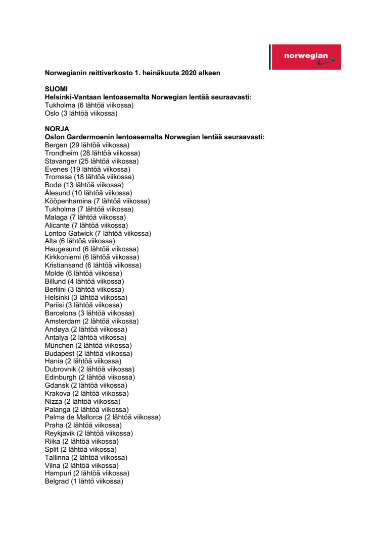Norwegian aloittaa uudelleen 76 lentoreittiä 1. heinäkuuta alkaen. Reittejä avataan sekä maiden sisäisillä että ulkomaan reiteillä Euroopassa. Reittien uudelleen käynnistäminen on tulosta asiakkaiden kasvaneesta kysynnästä ja siitä, että useat muut lentoyhtiöt ovat jo aloittaneet lennot uudelleen Euroopassa. Suomessa Norwegian aloittaa jälleen lennot Tukholmaan ja Osloon.