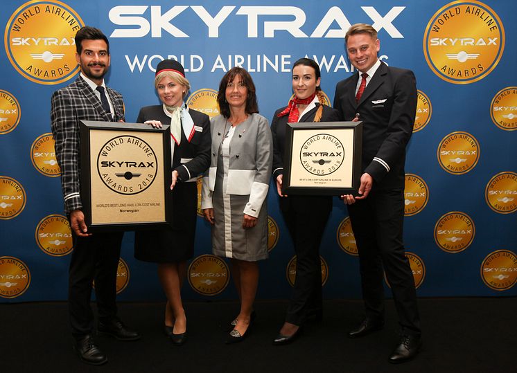 Norwegianin viestintäjohtaja Anne-Sissel Skånvik (keskellä) yhdessä Norwegianin Lontoon Gatwickin tukikohdan työntekijöiden Francesco Sapuppon, Nancy Lily Wheelerin, Agne Zupkaiten ja Marcin Krzywickin kanssa.